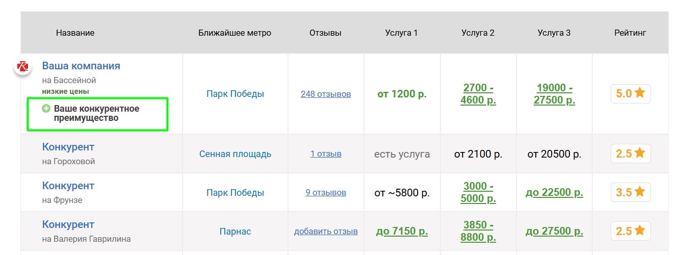 Если компания имеет конкурентные преимущества, мы можем их опубликовать на странице типографии и показывать в таблицах в соответствующих страницах. Преимущества можно гибко настраивать для разных услуг. Правильная публикация преимуществ существенно увеличивает интерес клиентов, так как выделяет типографию в таблицах и показывает, почему следует обратиться именно туда.